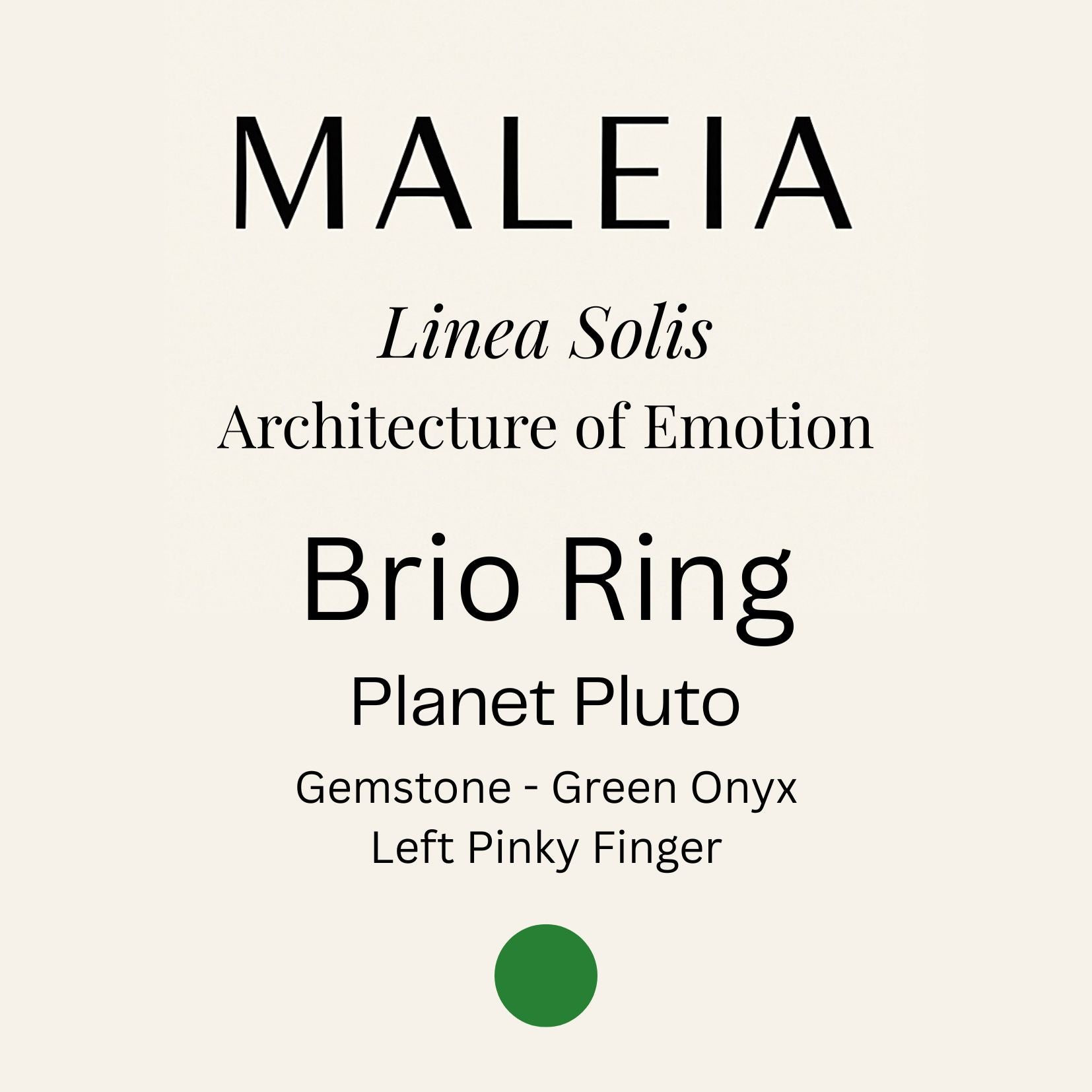The Brio Ring in Green Onyx embodies grounded strength and quiet determination. Worn on the left pinky finger, it aligns with Pluto, the planet of transformation, depth, and inner power.